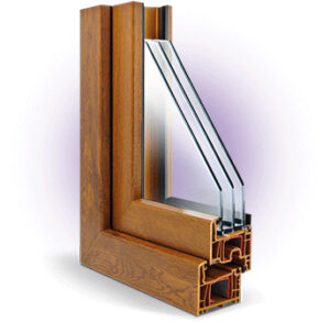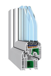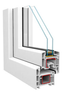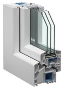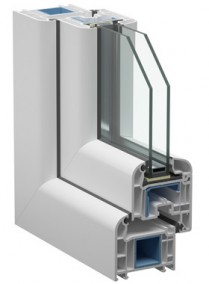 Отличные показатели по теплозащите — 0,64 м²х°С/Вт и шумоизоляции — от 39 до 42 дБ достигаются за счет продуманной геометрии профиля: широкие внутренние камеры повышают тепловое сопротивление, дистанционные приливы не дают армирующему профилю соприкасаться с пластиком, кроме того, само расположение армирующего профиля создает дополнительные воздушные камеры, улучшающие оба показателя.