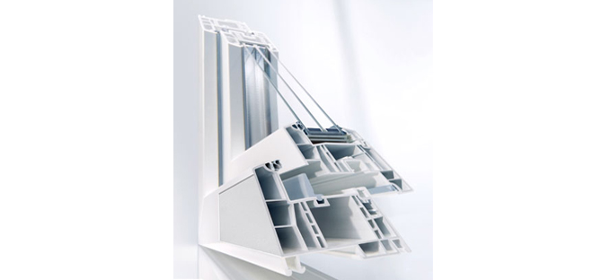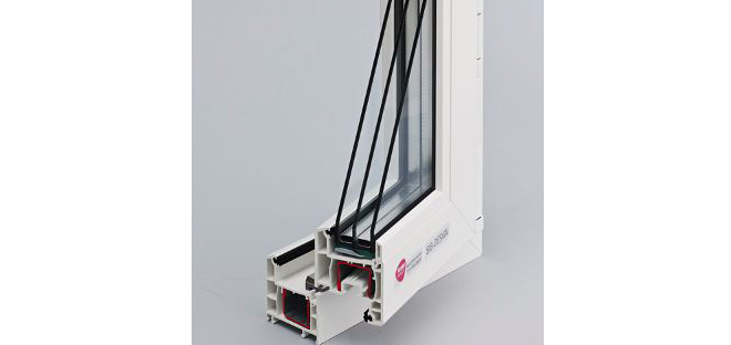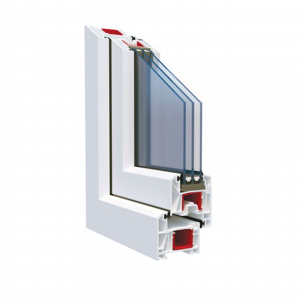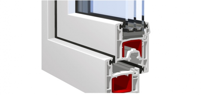 Отличные показатели по теплозащите — 0,64 м²х°С/Вт и шумоизоляции — от 39 до 42 дБ достигаются за счет продуманной геометрии профиля: широкие внутренние камеры повышают тепловое сопротивление, дистанционные приливы не дают армирующему профилю соприкасаться с пластиком, кроме того, само расположение армирующего профиля создает дополнительные воздушные камеры, улучшающие оба показателя.